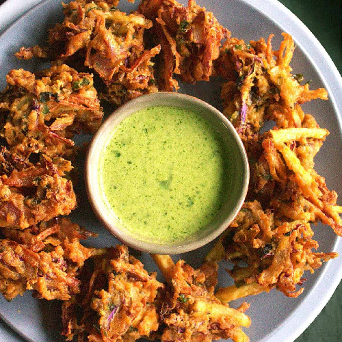 Pakoda, Gulab jamun/ice cream.