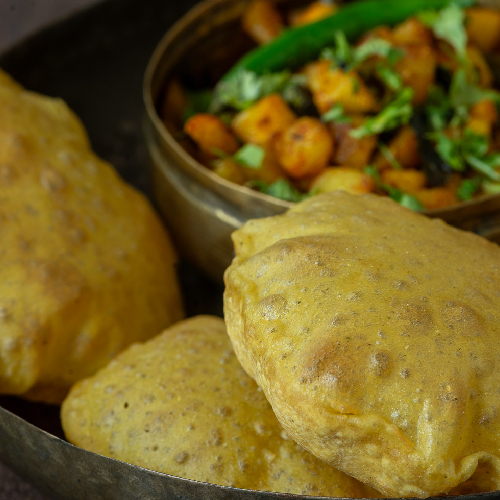 Bedami Poori, Bhaji, Kaddu ki sabji, Raita, Chole, Aloo ke Gutke, Rawa Halwa.